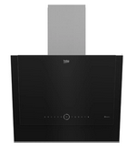Hotte décorative de 90 cm avec 3 vitesses, 645 m³/h de débit d’air, éclairage LED et filtres à graisse métalliques lavables, finition inox et verre noir.